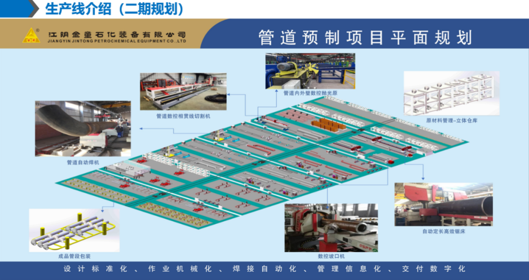 作為管道預(yù)制工廠化的實施主體之一,金童裝備公司三年前進(jìn)行了戰(zhàn)略布局,相繼投入4億元,規(guī)劃建設(shè)了占地面積近40000㎡的智能制造示范性工廠,并計劃于2024年底全面建成,屆時集設(shè)計標(biāo)準(zhǔn)化、采購集約化、作業(yè)機械化、焊接自動化、管理信息化、交付數(shù)字化的先進(jìn)管道預(yù)制智能制造項目將全面投用。在未來的工作中,金童裝備公司將繼續(xù)秉承“質(zhì)量第一、安全至上、創(chuàng)新驅(qū)動、綠色發(fā)展”的理念,以本次中期驗收為契機,進(jìn)一步總結(jié)經(jīng)驗、查找不足、明確方向、制定措施,繼續(xù)深化“六化”建設(shè)在管道預(yù)制工廠化領(lǐng)域的應(yīng)用與研究,努力推動課題工作再上新臺階、再創(chuàng)新佳績,不斷提升管道預(yù)制工廠化的水平,努力打造成為行業(yè)內(nèi)的標(biāo)桿企業(yè)。