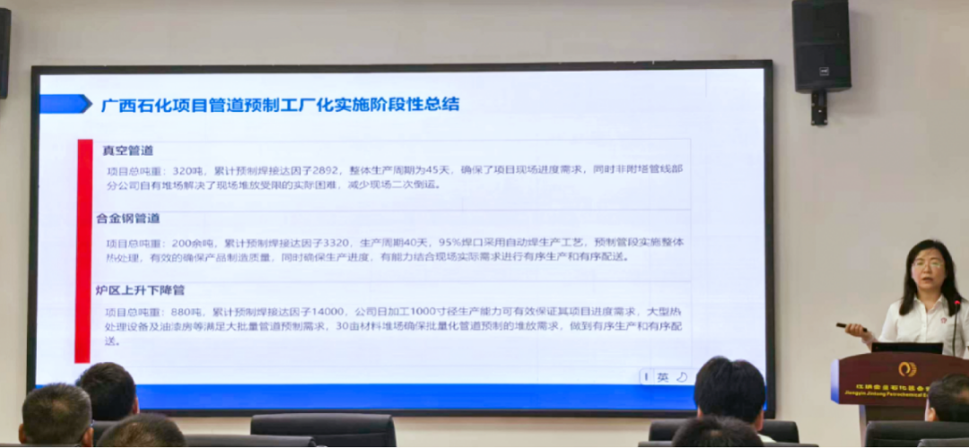 金童裝備公司常務(wù)副總兼總工程師韓越女士作“管道預(yù)制智能制造示范項目”的介紹及實施經(jīng)驗分享。管道預(yù)制工廠化模式是工廠化預(yù)制的延伸,預(yù)制工廠化實施的主體是專業(yè)化的制造廠,質(zhì)量控制體系與檢試驗設(shè)備、機械化作業(yè)與信息化管理等完全按照設(shè)備制造廠的模式實施,確保了產(chǎn)品質(zhì)量的可控性和可追溯性;預(yù)制工廠的廠房、專業(yè)化設(shè)備、專業(yè)化人員等相對是穩(wěn)定并且是共享型的,為整個市場服務(wù),不是針對某個項目,可有效的降低項目建設(shè)臨時設(shè)施的投入;多個項目同步實施可大比例的提高原材料利用率,同時庫存材料可解決項目建設(shè)及后續(xù)運行維護(hù)過程緊急用料的需求,有效的為管道系統(tǒng)長周期穩(wěn)定運行提供保障;標(biāo)準(zhǔn)化預(yù)制工作流程有利于加快施工進(jìn)度、縮短建設(shè)周期、提高管道建設(shè)的效率和質(zhì)量;管道預(yù)制工廠化模式是管道預(yù)制件的商品化供應(yīng)的基礎(chǔ),其獨有的專業(yè)性、穩(wěn)定性、經(jīng)濟(jì)性、共享性,決定管道預(yù)制工廠化可以為管道項目建設(shè)提供最為優(yōu)良的解決方案。